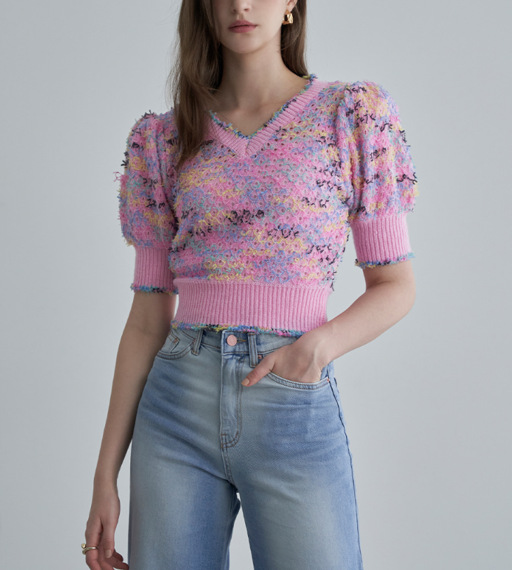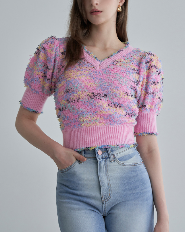 <모델명> 컬러풀 레인보우 브이넥 반팔 니트 LM06KN103L 핑크8월13일 신지티 니트티 티셔츠 분홍색 분홍 핑크색 핑크 퍼프 니트 옷 의상 코디 패션