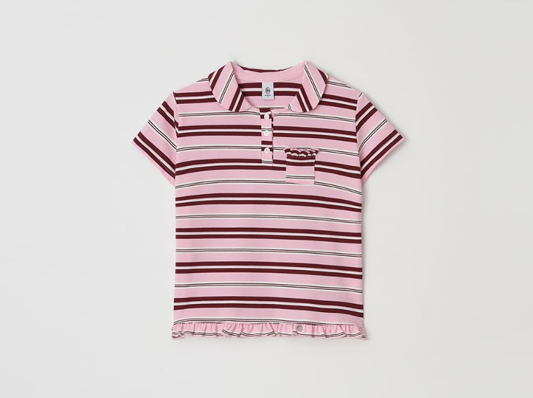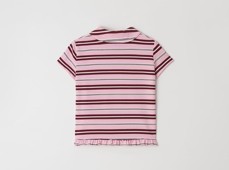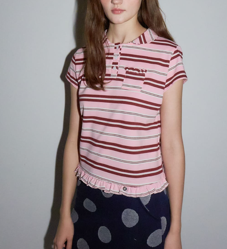 RUFFLE ROUND COLLAR PK T SHIRT PINK STRIPE 제품입니다.