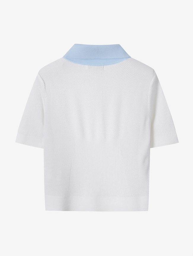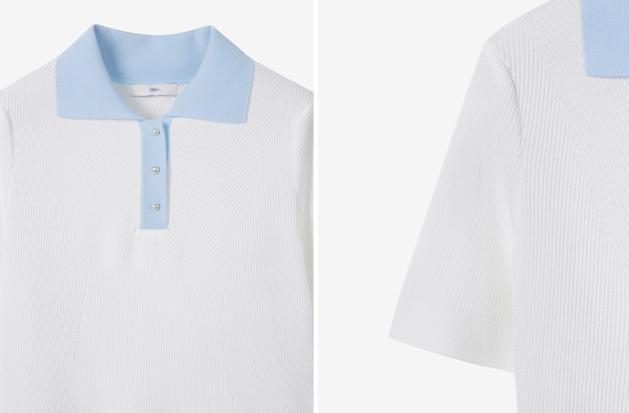 ✔️ 하늘색 배색 카라 + 3버튼 디자인으로 단정하고 청량한 무드 연출