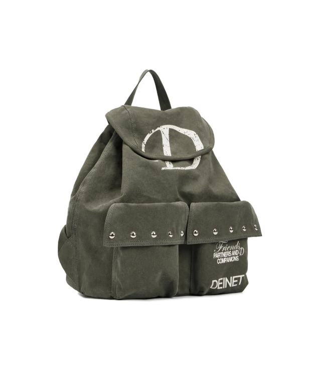 정인선이 착용한 백팩은 '다이닛(DEINET)'의 제품으로, 카키색 캔버스 소재가 주는 빈티지한 감성이 특징입니다. 가방의 메인 플랩에는 브랜드의 시그니처인 커다란 'D' 로고가 프린팅되어 있어 포인트를 주며, 전면에 달린 두 개의 포켓에는 징(스터드) 디테일이 더해져 유니크한 스트리트 무드를 연출합니다. 넉넉한 사이즈와 플랩-드로스트링 결합 방식으로 수납력과 실용성을 동시에 갖춘 아이템입니다.