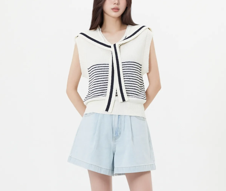 - 마린룩: 화이트 팬츠와 조합해 여름 바캉스룩 완성.