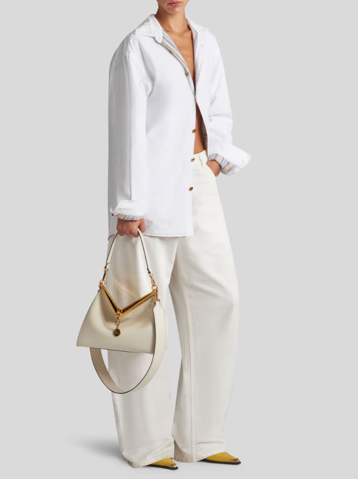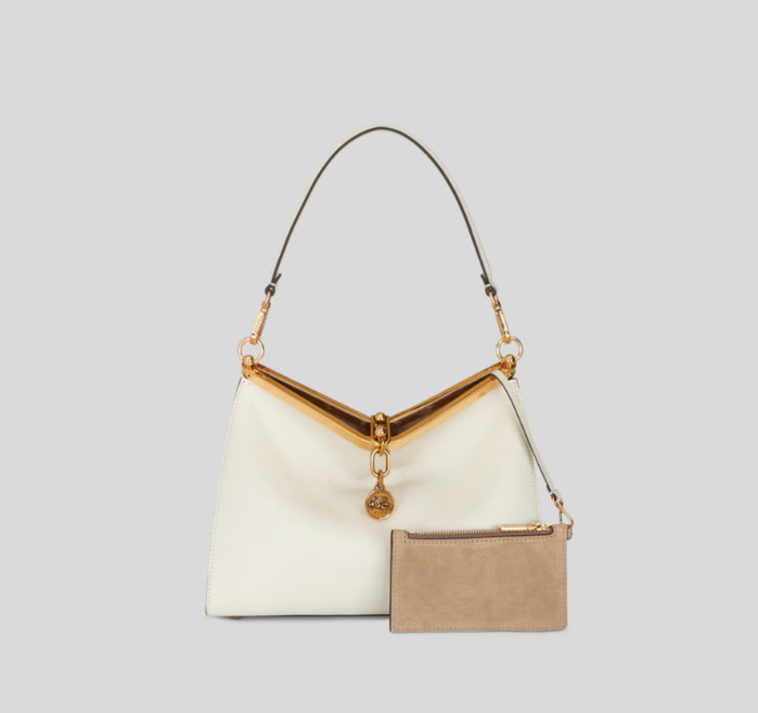 고원희님이 착용한 가방은 바로 이탈리아 명품 브랜드, 에트로(ETRO)의 아이코닉한 '미디엄 VELA 백'입니다. 고급스러운 가죽으로 제작되어 클래식하고 우아한 분위기를 자아내죠. 특히 이 가방의 가장 큰 매력은 독특한 메탈 잠금 장치에 있습니다. 동전 주조 기법으로 제작된 ETRO 로고와 페가수스(Pegaso) 심벌 메달리온 디테일이 더해져 에트로만의 독보적인 헤리티지를 보여주고 있어요.