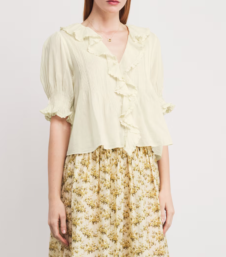유기농 면 보일 소재로 제작된 풍성한 실루엣이 돋보입니다.8월21일 프릴 러플 블라우스 옷 의상 코디 패션