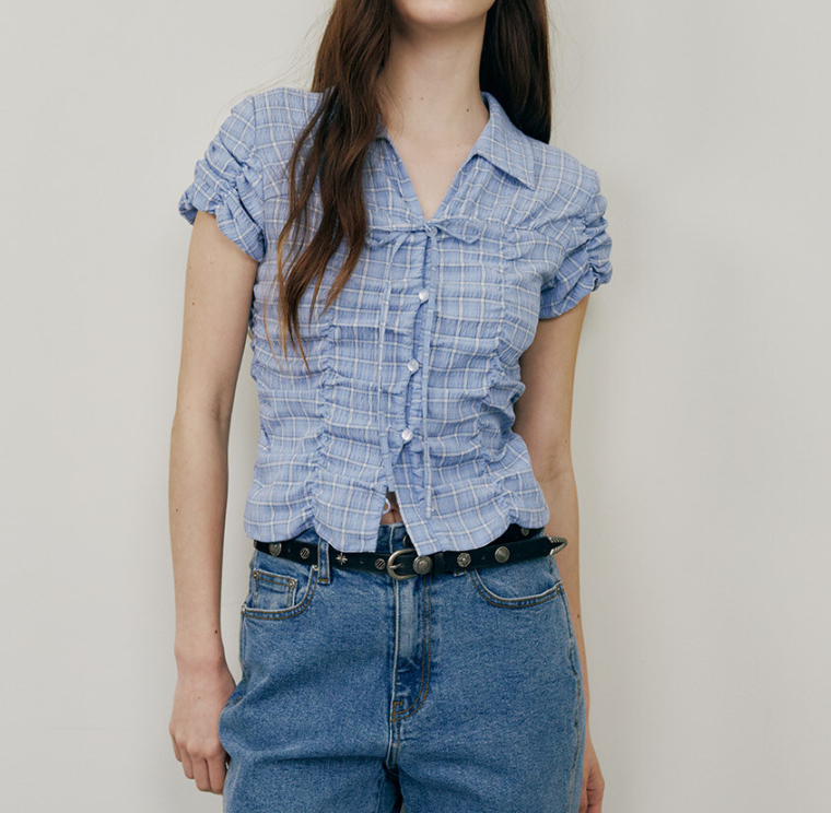 앞면에 있는 리본 디테일이 러블리한 포인트를 주며, 캐주얼한 체크 패턴과 페미닌한 셔링이 조화를 이루어 다양한 분위기로 활용하기 좋아요. 소매 부분의 퍼프 디자인과 크롭 기장이 귀엽고 트렌디한 느낌을 더해줍니다.