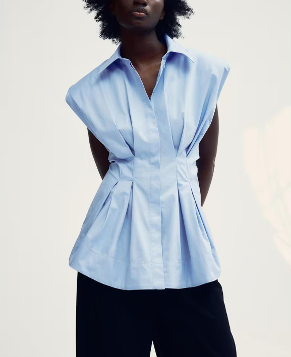 이 블라우스의 가장 큰 매력은 바로 허리 실루엣을 살려주는 디자인이에요. 앞뒷면에 섬세한 플리츠가 잡혀 있어 허리를 더욱 날씬하고 여성스럽게 보이도록 해줍니다. 칼라가 있는 슬리브리스 디자인이라 팔 라인을 시원하게 드러내주어 시원한 느낌을 주며, 어깨에 내장된 숄더 패드가 어깨 라인을 잡아주어 더욱 세련된 핏을 연출할 수 있어요.