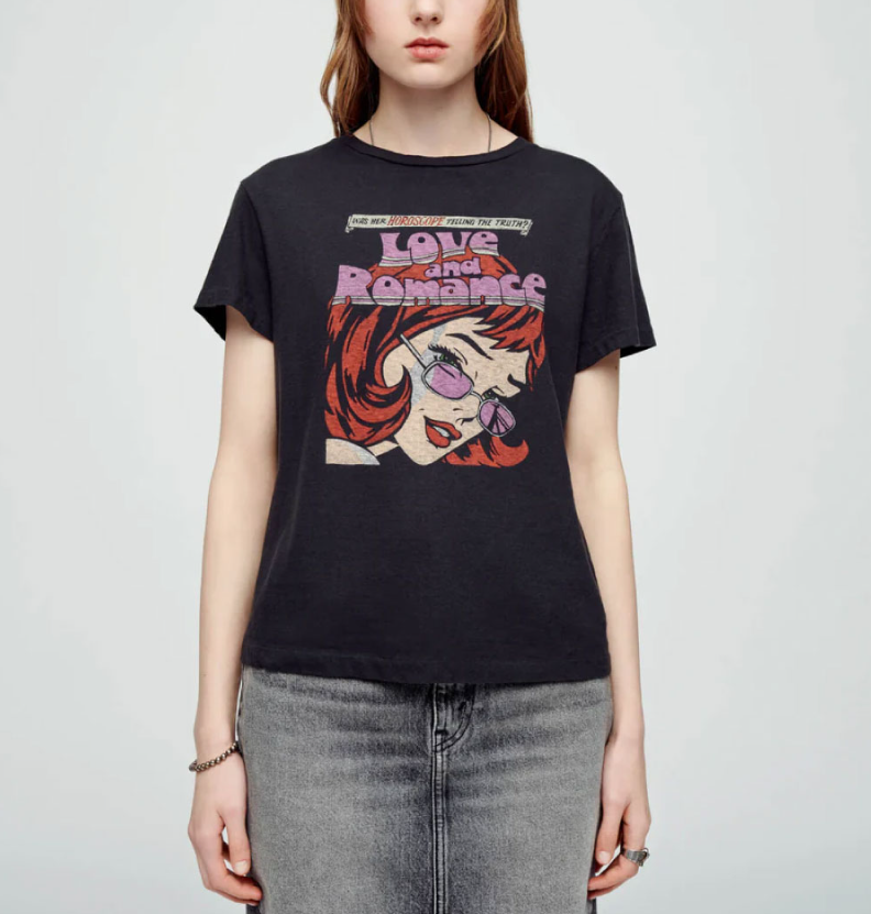 한혜진 님이 인스타그램에서 착용한 이 멋진 티셔츠는 바로 **'리던(RE DONE)'**이라는 브랜드의 제품입니다. 모델명은 '리던 클래식 로맨스 티셔츠'라고 하네요. 빈티지한 워시드 블랙 컬러가 그래픽의 매력을 더욱 살려주는 것 같아요.