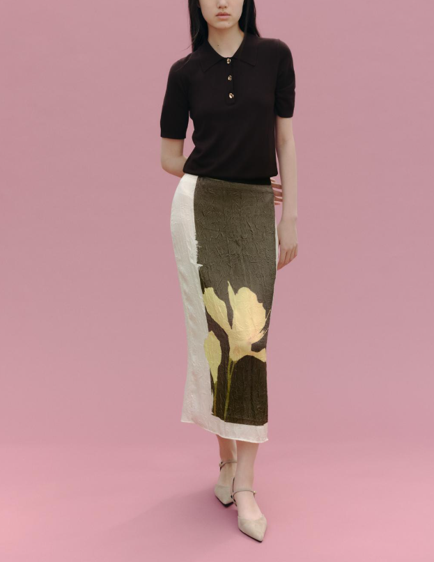이 스커트의 가장 큰 포인트는 단연 독특한 프린트와 주름 효과에 있어요. 마치 유화 물감을 덧바른 듯한 느낌의 프린팅이 고급스러우면서도 예술적인 분위기를 자아내죠. 또한 전체적으로 들어가 있는 주름 디테일이 스커트의 실루엣을 더욱 풍성하고 입체적으로 만들어줍니다. 하이웨이스트 디자인이라 허리 라인을 예쁘게 잡아주면서 다리가 길어 보이는 효과도 있고요. 뒷면에는 트임이 있어 활동성까지 놓치지 않았답니다.