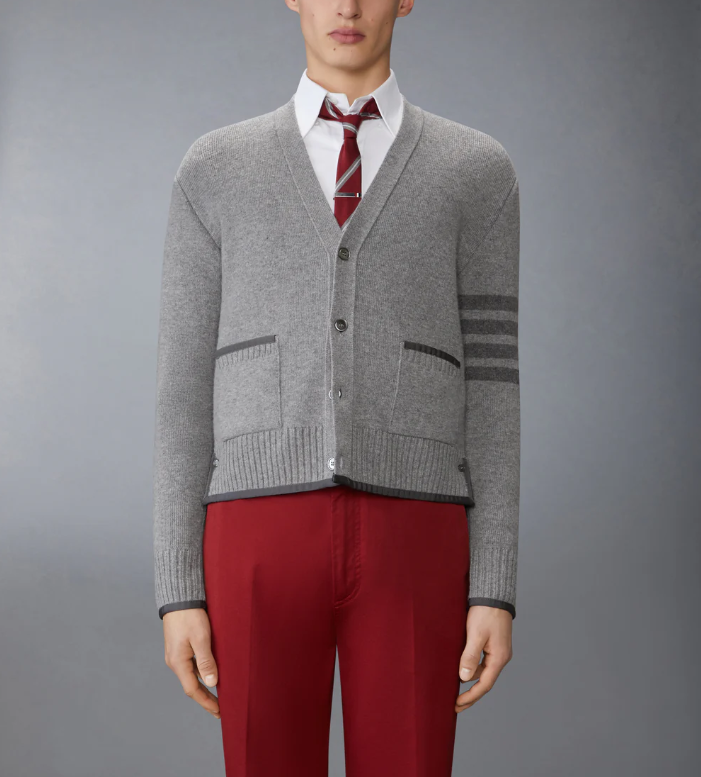 도운이 착용한 이 가디건은 바로 '톰브라운(Thom Browne)'의 '밀라노 스티치 메리노 울 4-바 브이넥 카디건' 모델입니다.
