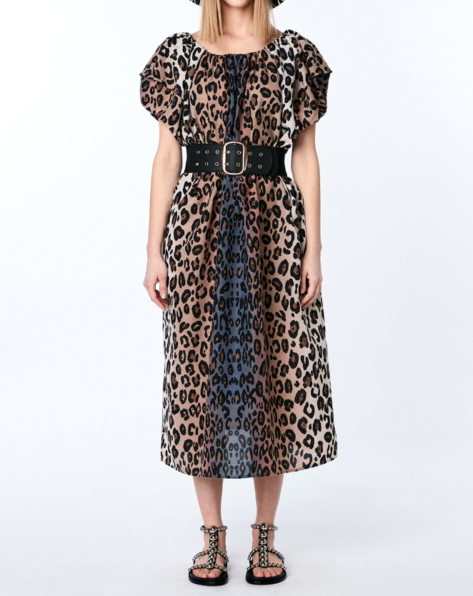 호피 레오파드 패턴이 전체적으로 들어가 있어 강렬한 인상을 주면서도, 부드러운 소재와 실루엣으로 우아함을 잃지 않는 디자인이 특징입니다. 특히 허리에 둘러진 넓은 가죽 벨트와 함께 매치해 시선을 사로잡았죠.