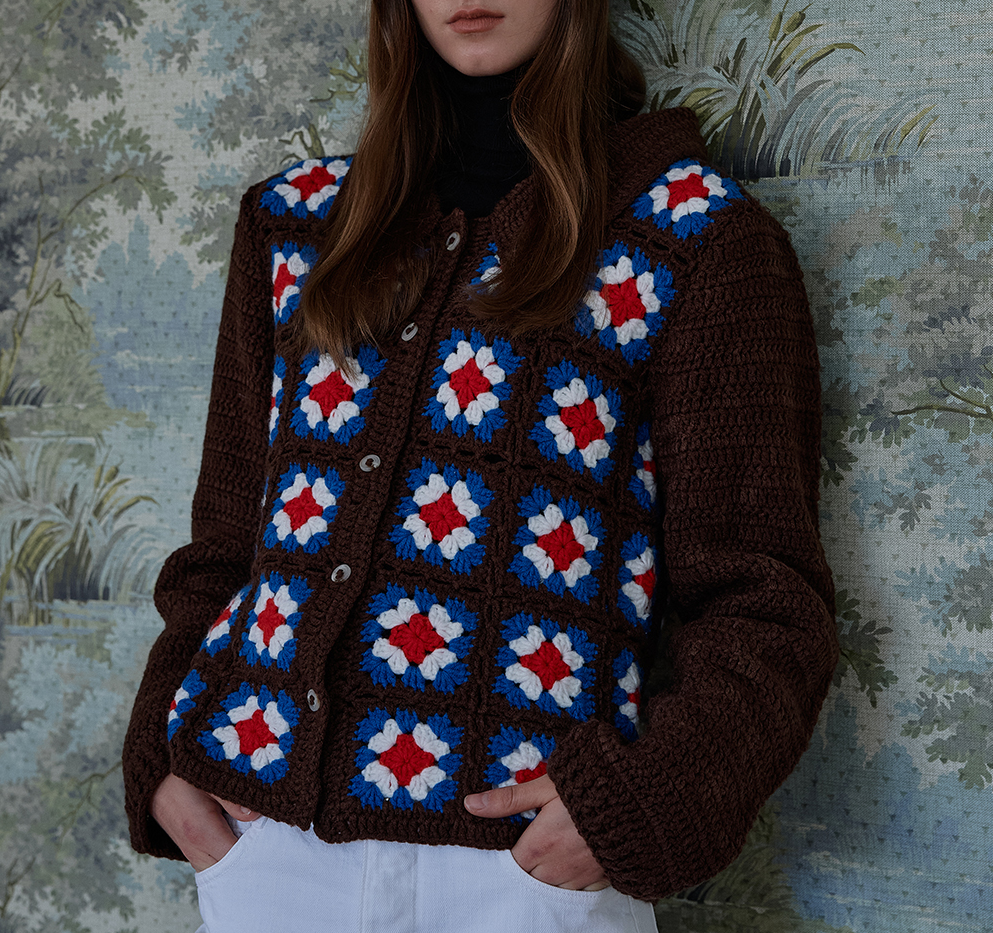 두 번째는 미스터차일드(MISTERCHILD) 브랜드의 'CROCHET GARDEN CARDIGAN RED' 입니다. 강렬한 레드 컬러에 수작업으로 한 땀 한 땀 만든 니트 크로셰 플라워 장식이 포인트인 제품입니다.