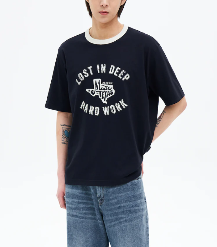 - 트렌디한 그래픽: 티셔츠 전면에 들어간 'LOST IN DEEP HARD WORK'라는 타이포그래피 프린트가 트렌디하면서도 빈티지한 분위기를 연출합니다. 텍사스 주 모양의 그래픽도 재미있는 포인트죠.