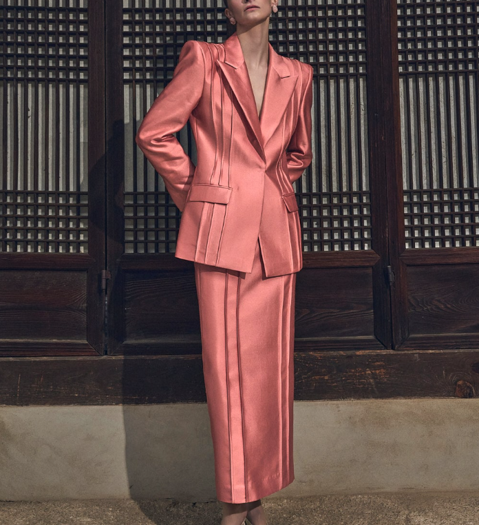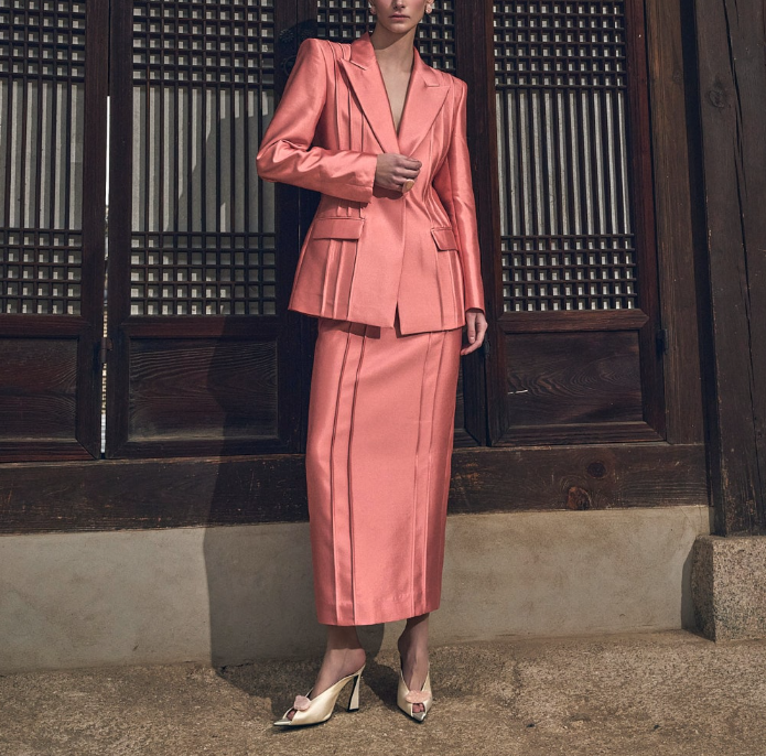 이 셋업은 단순한 핑크색이 아닌, 은은한 광택감이 도는 소재로 제작되어 보는 각도에 따라 고급스러운 분위기를 연출합니다. 특히 자켓과 스커트 모두 세로로 들어간 핀턱(주름) 디테일이 특징인데요. 이 디테일 덕분에 전체적으로 슬림하고 키가 커 보이는 효과를 주며, 단순할 수 있는 디자인에 입체감을 더했습니다. 딱 떨어지는 실루엣과 유행을 타지 않는 클래식한 디자인으로 격식 있는 자리나 중요한 모임에 활용하기에도 좋습니다.