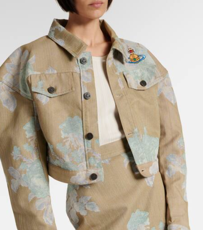 이 재킷은 부드러운 베이지 톤의 데님 원단에 블루 계열의 플라워 패턴이 빈티지하면서도 세련된 느낌을 줍니다. 특히, 짧은 크롭 기장으로 다리를 길어 보이게 하는 효과가 있으며, 비비안웨스트우드의 시그니처인 오브(Orb) 로고가 가슴 부분에 자수로 새겨져 있어 브랜드의 정체성을 강조합니다. 흔치 않은 디자인과 컬러 조합으로 소장 가치가 높은 아이템입니다.