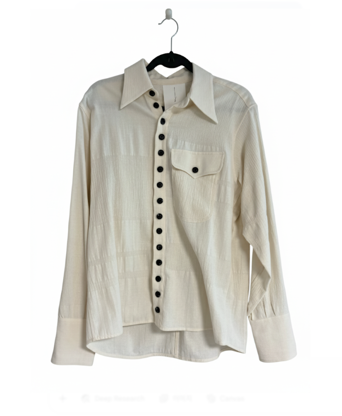 신승훈 씨가 착용한 셔츠는 부드러운 크림색 톤으로 자연스러운 주름과 단추의 블랙 컬러가 대비를 이루어 심플하면서도 세련된 분위기를 자아냅니다. 고급 소재를 사용해 착용감이 뛰어나고, 넉넉한 핏으로 편안함까지 챙겼어요.