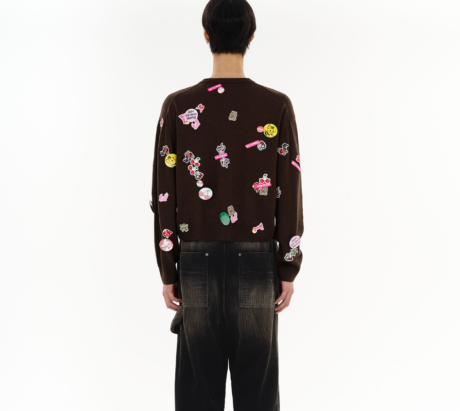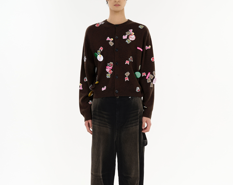 - 힙하고 유니크한 패치 디테일: 가디건 전면에 다양한 그래픽 패치가 빼곡하게 장식되어 있습니다. 키치하면서도 힙한 무드를 완성하며, 평범한 가디건을 특별한 아이템으로 만들어줍니다.