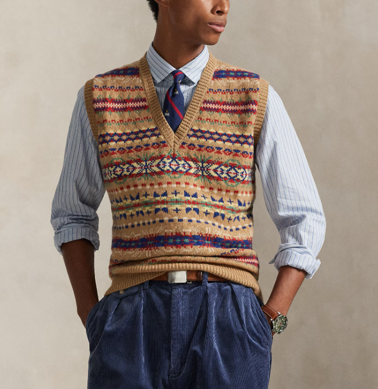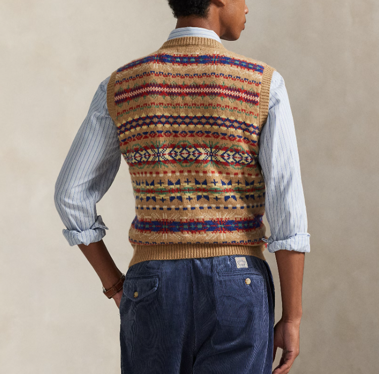 이 조끼의 가장 큰 매력은 전통적이면서도 다채로운 페어 아일 패턴이에요. 단조롭지 않은 컬러감이 봄, 가을은 물론 한겨울까지 포인트 아이템으로 톡톡히 역할을 하죠. 울 소재라 보온성과 퀄리티도 뛰어나며, 폴로 랄프 로렌 특유의 클래식함이 잘 살아있습니다.