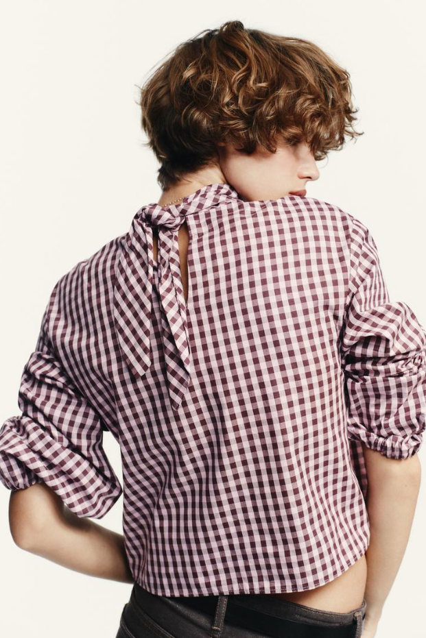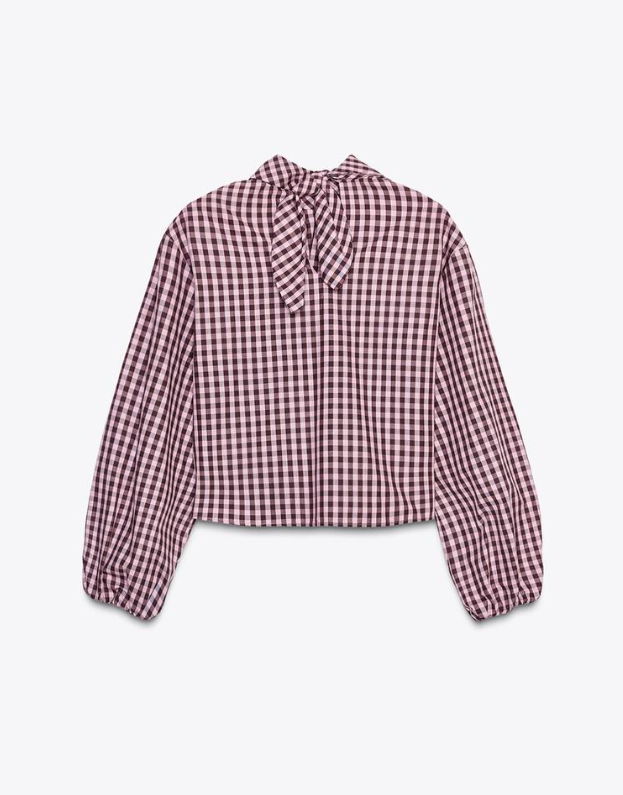 리본이 달린 하이넥 셔츠.