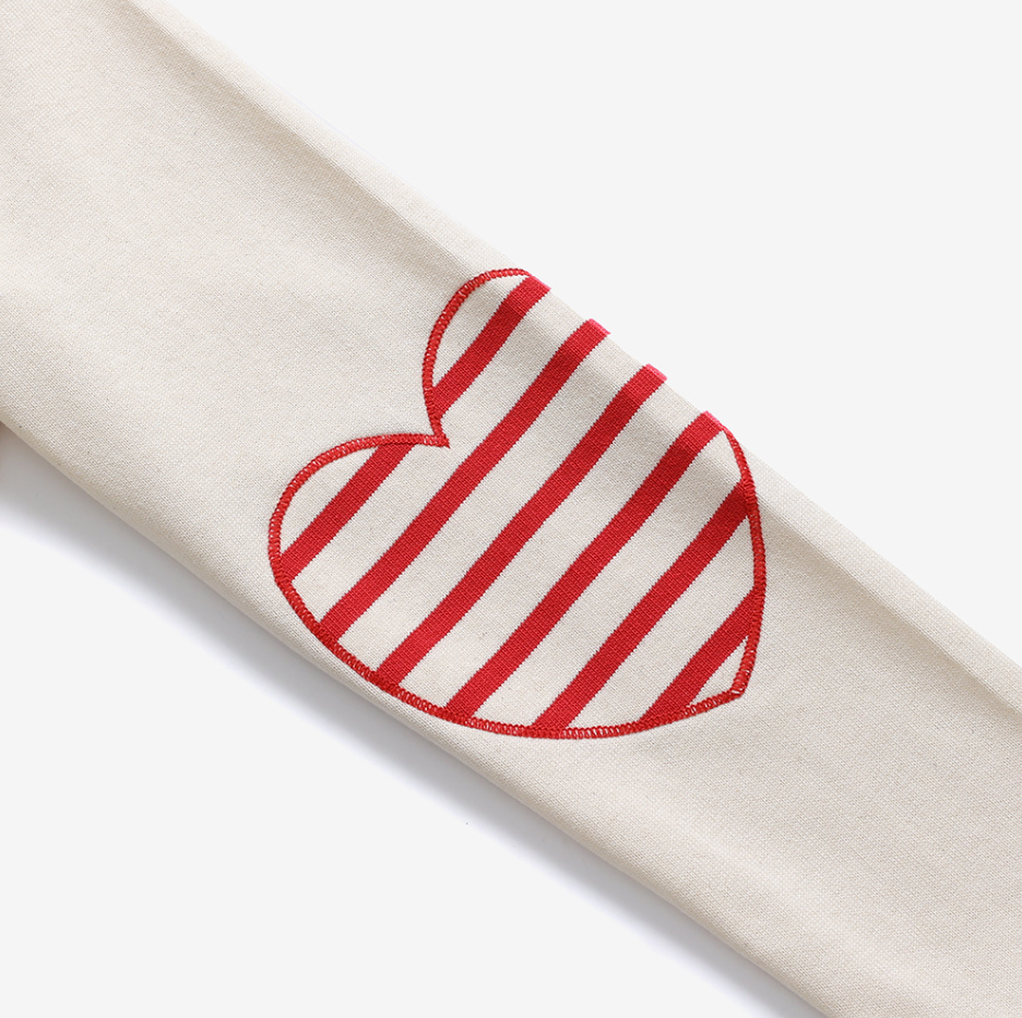 - 러블리한 하트 패치 포인트: 가장 큰 매력은 바로 팔꿈치에 숨겨진 디테일입니다. 스트라이프 패턴의 하트 모양 패치가 양쪽 팔꿈치에 부착되어 있어, 단조로운 솔리드 티셔츠에 유머러스하고 사랑스러운 포인트를 더해줍니다.