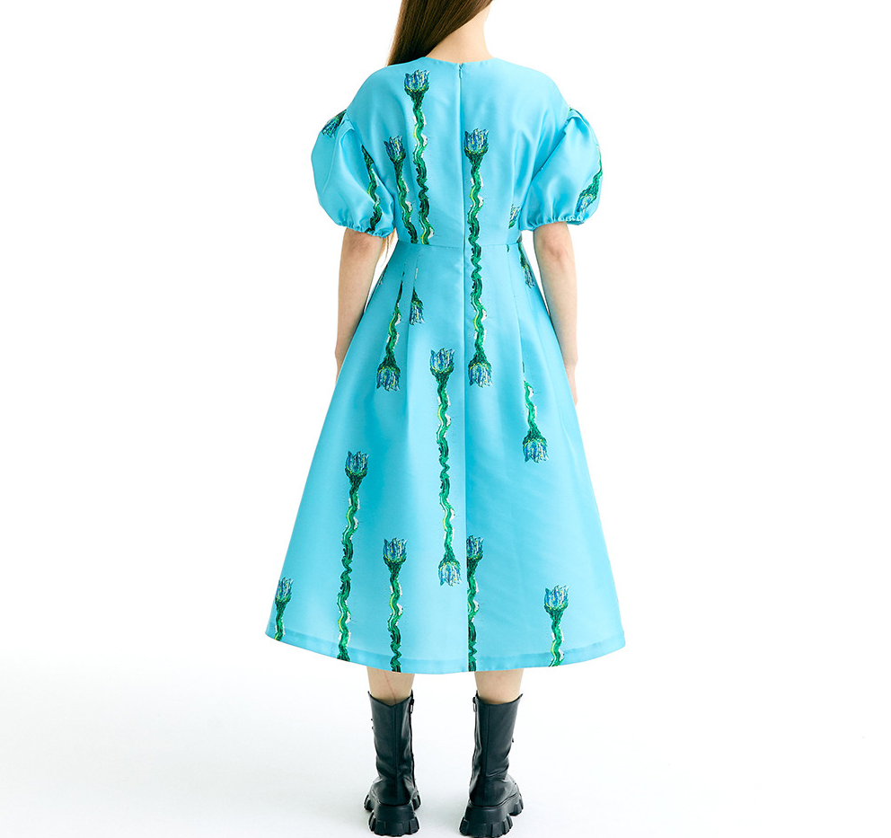 선명한 하늘색 바탕에 세로로 떨어지는 플라워 디테일이 특징으로, 화면에서도 존재감이 확실했죠.