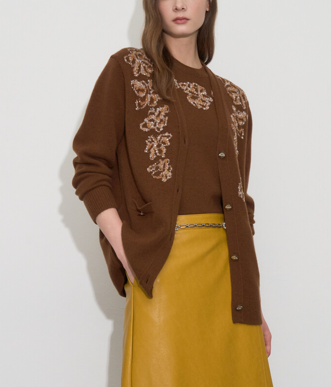같은 소재의 니트 탑과 함께 셋업으로 스타일링 가능한 아이템입니다.1월3일 1월4일 영라엄마 갈색 밤색 꽃자수 카디건 가디건 옷 의상 코디 패션
