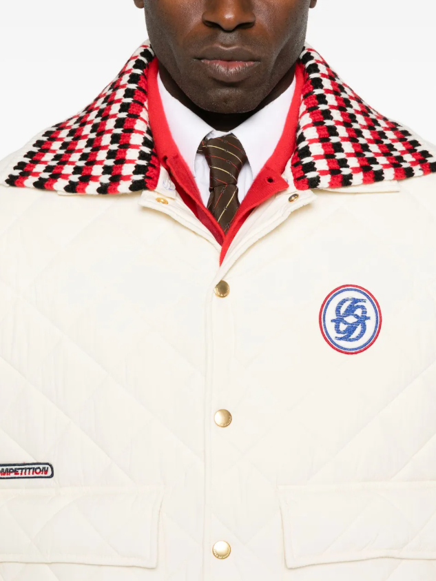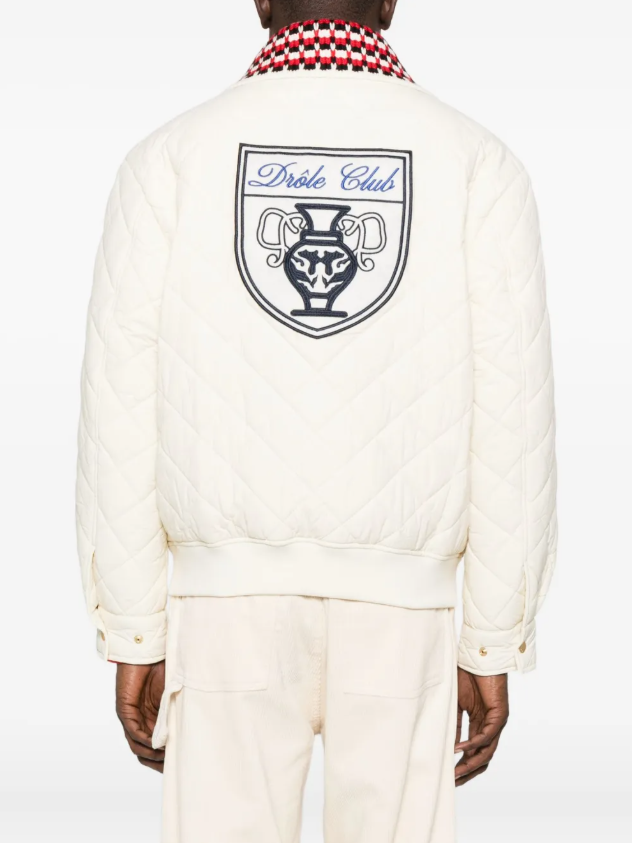 로고 패치 퀼팅 봄버 재킷 화이트 모델입니다.