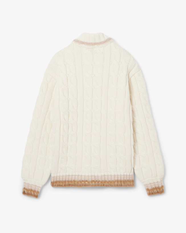 굵은 케이블 니트 조직으로 제작된 울 소재의 폴로 스웨터로,
