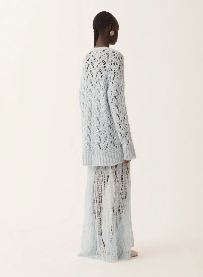 플래티넘 원사와 모헤어 혼방 소재로 제작된 오버사이즈 크루넥 스웨터입니다.