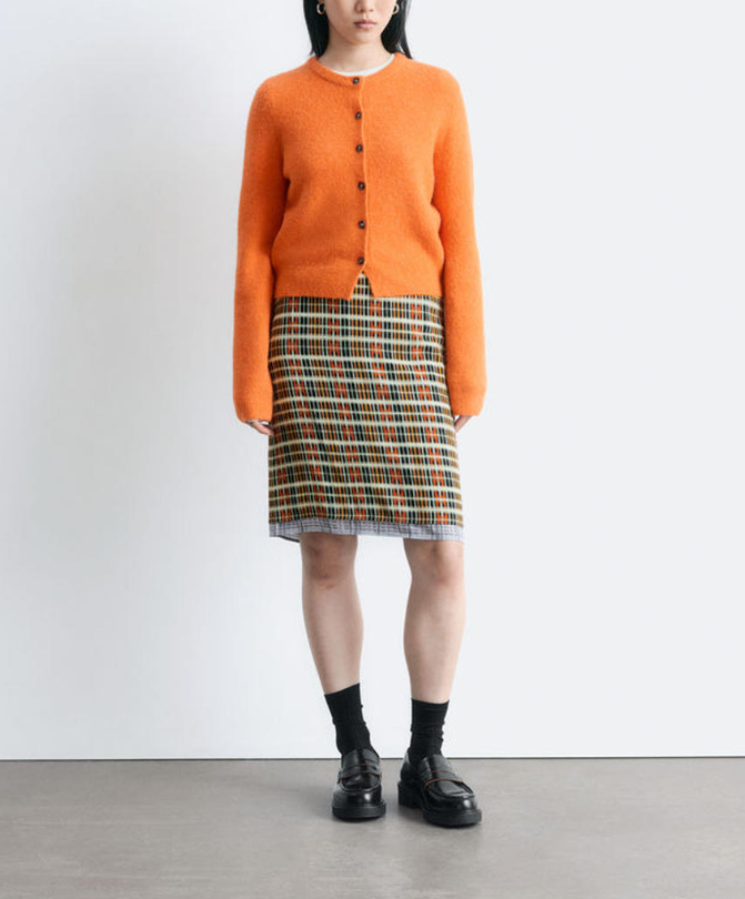 스트레이트 실루엣, 립 트리밍, 앞면의 단추가 특징이랍니다.1월26일 유인나 주황색 니트 가디건 옷 의상 코디 패션