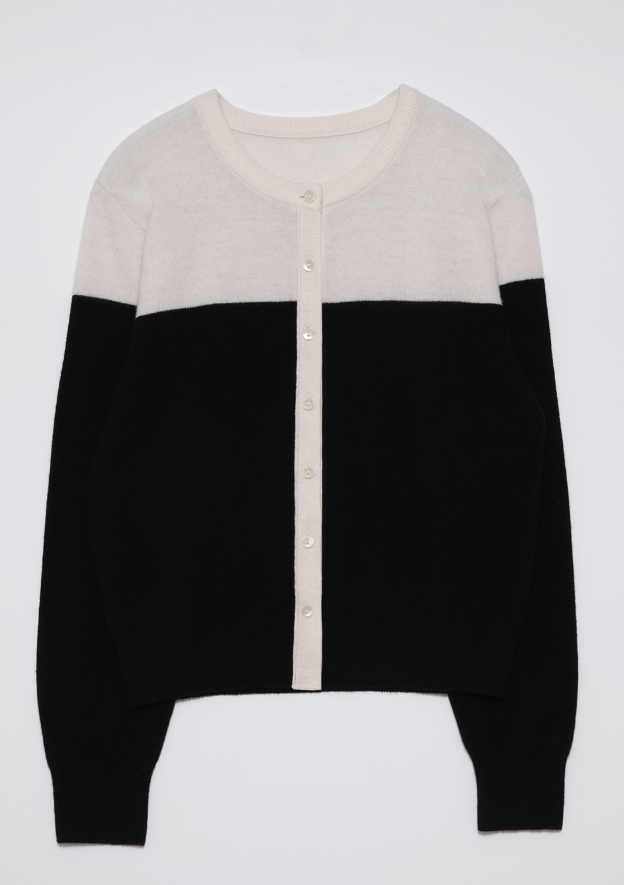 <모델명> 캐시미어 블렌드 홀가먼트 라운드 가디건 - 화이트&블랙1월29일 공회장 이승연 니트 가디건 블랙앤화이트 배색 카디건 옷 의상 코디 패션