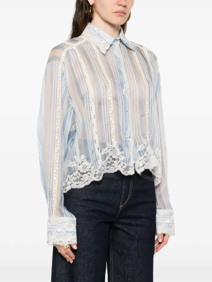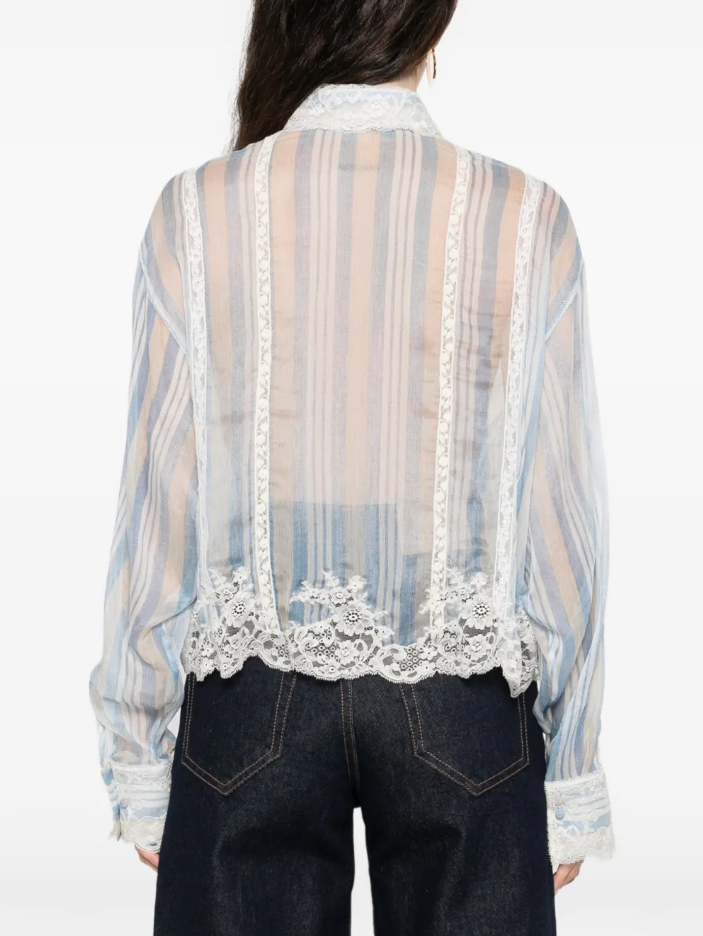 실크 100%, 면 90%, 폴리아미드 10%2월3일 한회장 블루 하늘색 줄무늬 레이스 셔츠 남방 옷 의상 코디 패션