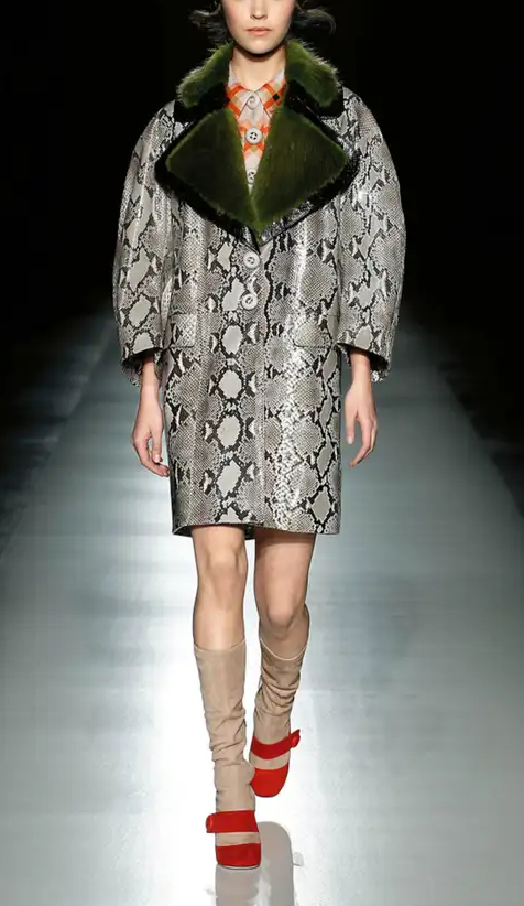 <모델명> Prada Fall 2011 Runway Ad Campaign Python and Green Fur Coat2월5일 털카라 파이톤 레더 코트 외투 아우터 옷 의상 코디 패션