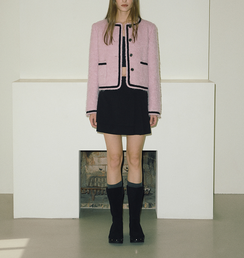 자켓 앞 라인과 포켓, 소매 끝에 배색 트리밍 디테일로 포인트를 주어 페미닌한 무드가 느껴집니다.