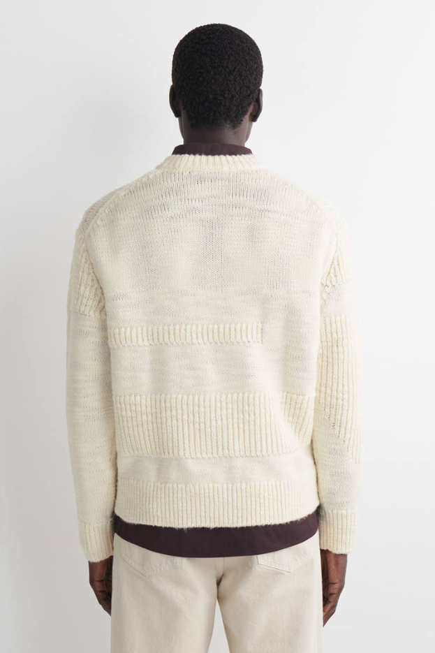 촉감이 우수한 RWS 울 소재로 만들어졌으며, 불규칙한 래더 스티치 디테일과