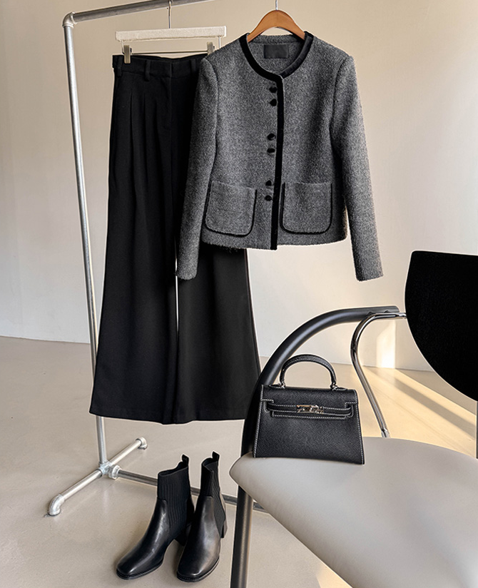 - 세련된 배색 파이핑 라운드넥 디자인으로 목선을 깔끔하게 정리해 주며, 중앙 버튼 라인과 포켓 라인을 따라 들어간 벨벳 배색 파이핑이 신의 한 수! 이 디테일 덕분에 밋밋하지 않고 클래식한 포인트가 살아납니다.