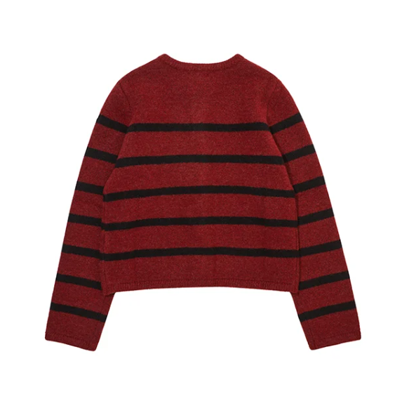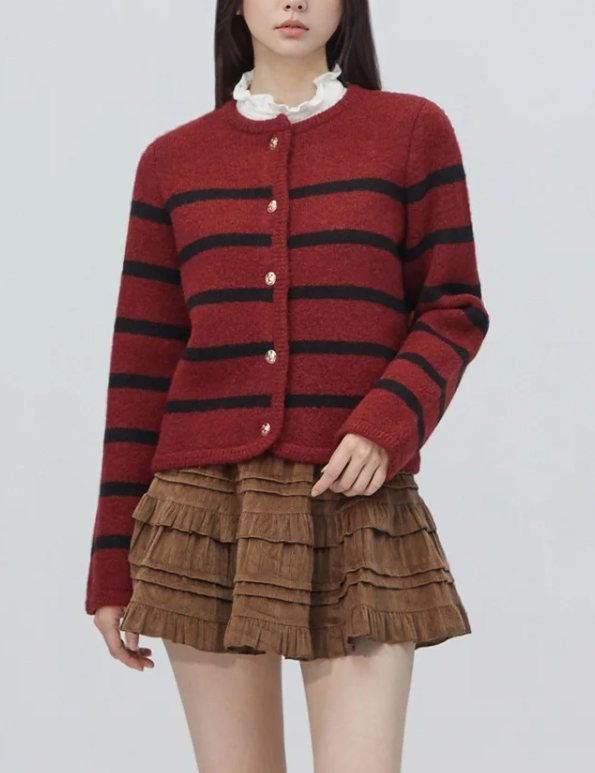 칼라감이 소프트해서 다양한 하의와 착용하기 좋은 니트 가디건 입니다.2월17일 언경이 조향기 빨간색 레드 줄무늬 가디건 옷 의상 코디 패션