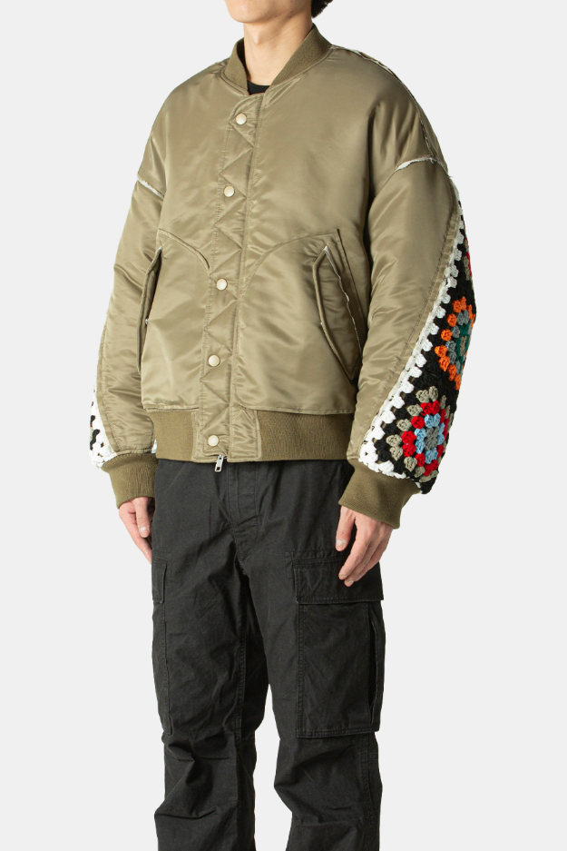 이 자켓의 정체성은 단연 소매에 있습니다. 일반적인 나일론 소매 대신, 형형색색의 코바늘 뜨개질(Crochet) 니트 소재를 덧대어 완성했는데요. 투박한 항공점퍼와 섬세한 니트의 만남이 이색적이면서도 트렌디한 분위기를 자아냅니다.