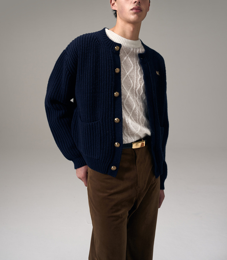 메리노 울 블렌드 가디건입니다. 두께감 있는 헤비 게이지 짜여져 보온성을 갖춘 제품으로 초겨울까지 착용하기 적합한 아이템입니다. 메탈 단추와 노이스 금속 로고, 아웃포켓 디테일로 포인트를 더했습니다.3월3일 김동현 옷 의상 코디 패션