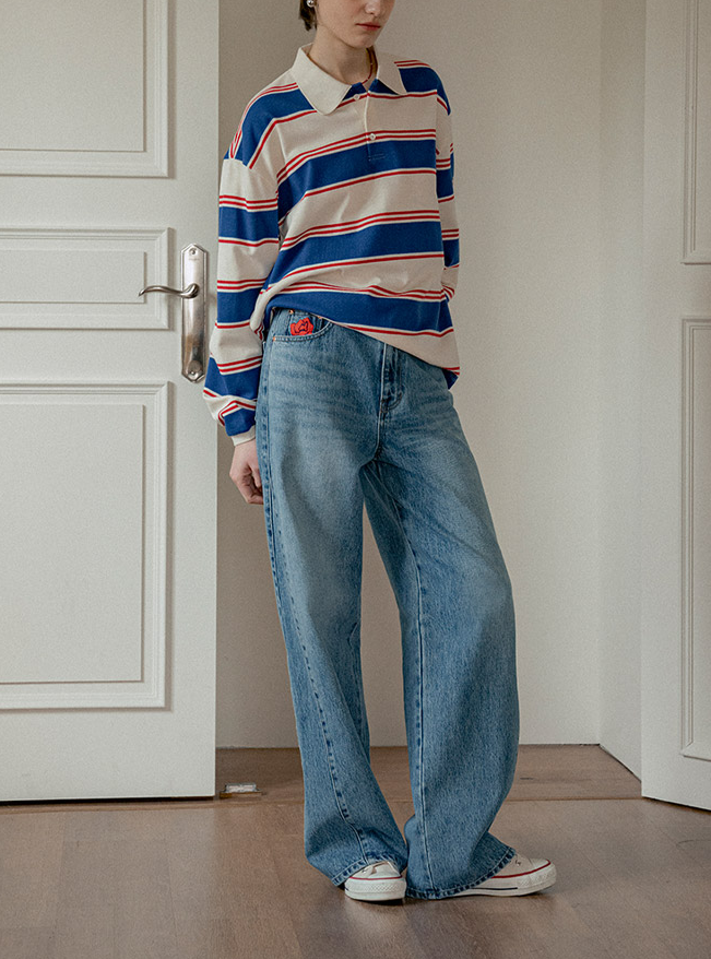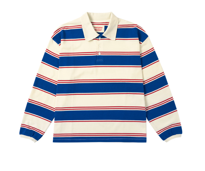 멀티 스트라이프 패턴의 오버핏 칼라 티셔츠입니다.