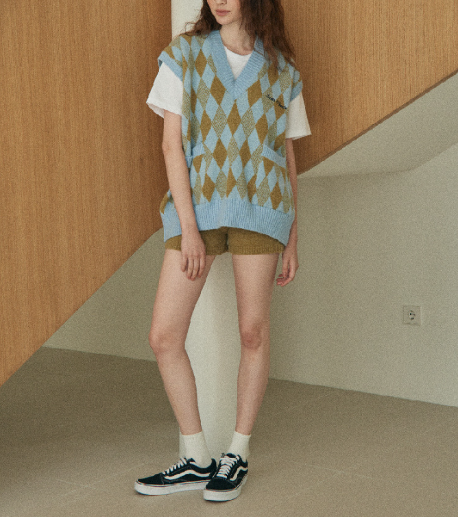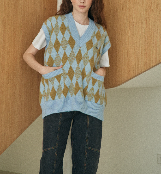 배색 컬러 다이아몬드 패턴이 포인트인 베스트는 오버사이즈 실루엣에 넉넉하게 파인 암홀 라인으로 다양한 아이템과 레이어드하기 좋습니다.3월4일 남상지 다이아 패턴 브이넥 조끼 베스트 옷 의상 코디 패션 하늘색
