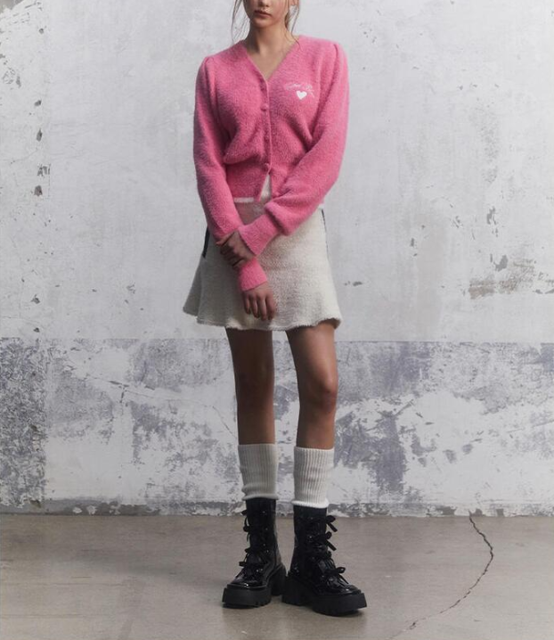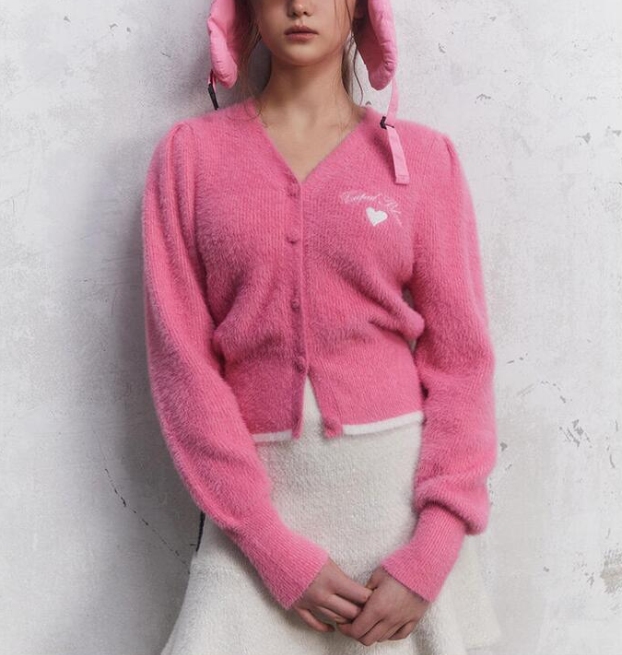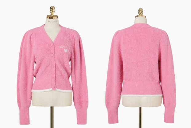 <모델명> [BLUE LABEL] 날개사 자수 포인트 V넥 가디건(EQ4OKG02)3월4일 3월10일 유나 분홍 핑크색 분홍색 퍼프 가디건 옷 의상 코디 패션