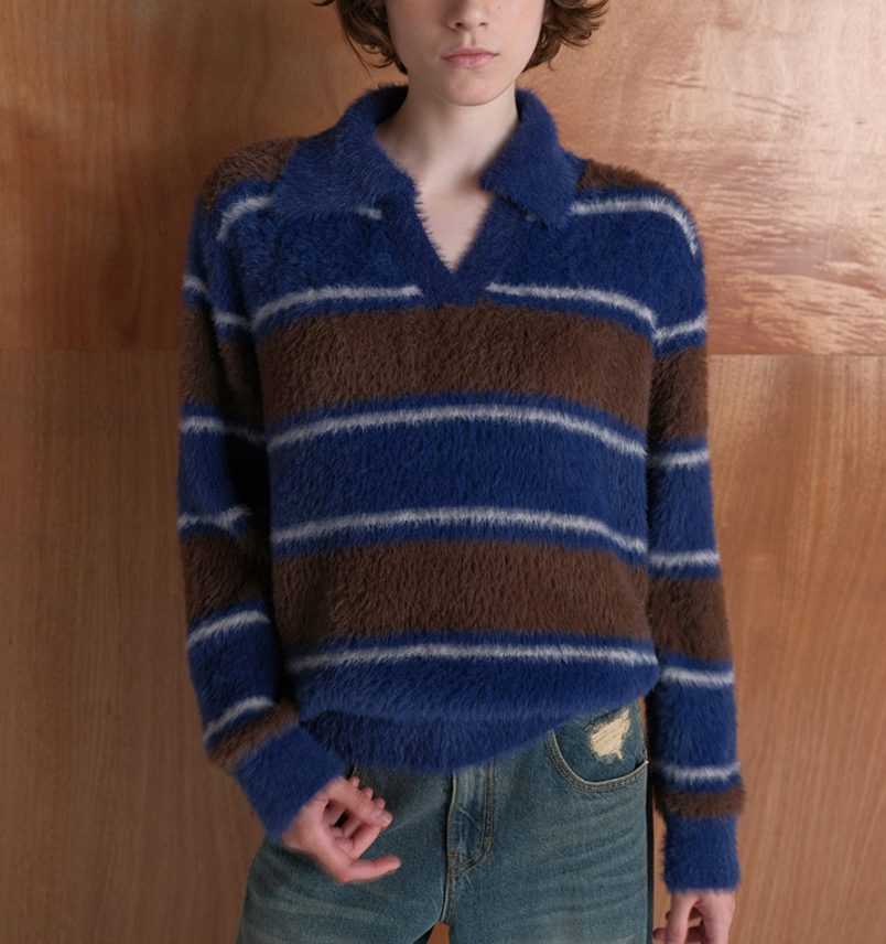 날개사에 스트라이프 패턴이 짜여져 볼륨감이 돋보이는 소재감