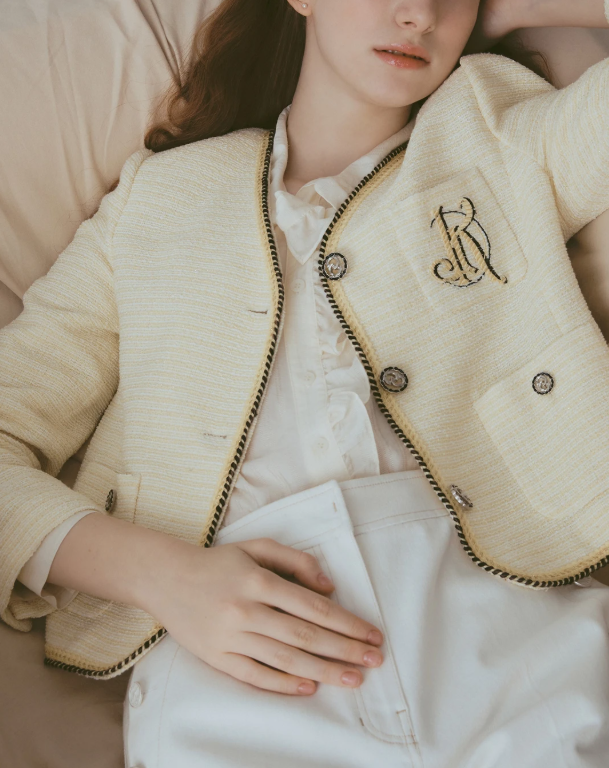 촘촘한 조직감이 느껴지는 트위드 소재로 페미닌하며 고급스러운 무드를 자아냅니다.3월13일 유나 노란색 트위드 재킷 외투 아우터 옷 의상 코디 패션