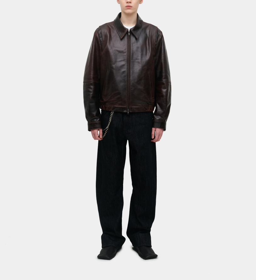 광택감이 특징인 레귤러핏의 램스킨 풀업 레더 점퍼